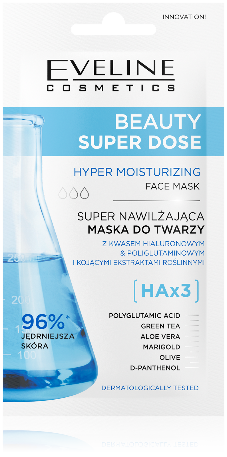 Innovative moisturizing face mask with hyaluronic and polyglutamic acid and soothing plant extracts. Intensively moisturizes and renews the skin.