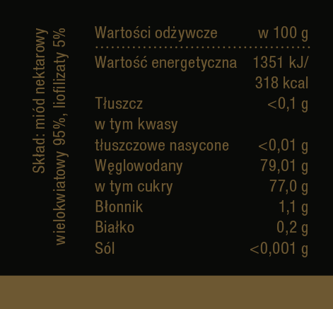 95% natural multiflower honey, 5% freeze-dried raspberries.