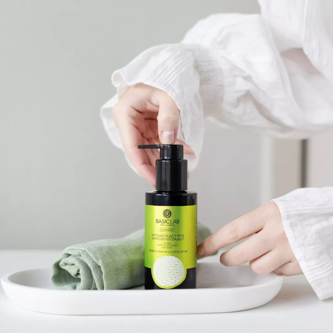 Wygładzający płyn mikrozłuszczający to całoroczny produkt delikatnie złuszczający dla każdego rodzaju skóry, w szczególności trądzikowej, ze skłonnością do zaskórników. Skutecznie reguluje wydzielanie sebum i oczyszcza ujścia gruczołów łojowych (tzw. pory), zmniejszając ich widoczność.
