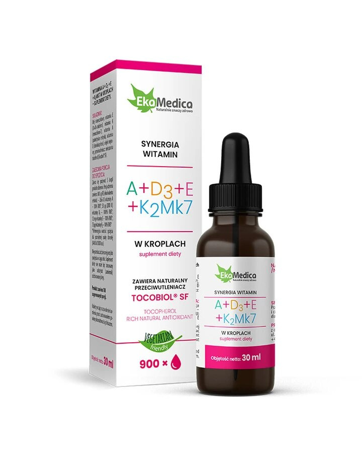 - Synergia witamin A + D3 + E + K2Mk7 w kroplach z wyjątkową formułą Tocobiol SF suplement diety.