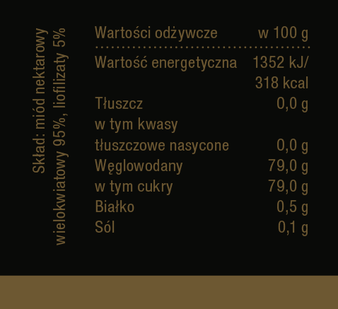 Naturalny miód nektarowy wielokwiatowy 90%, liofilizaty 10%.