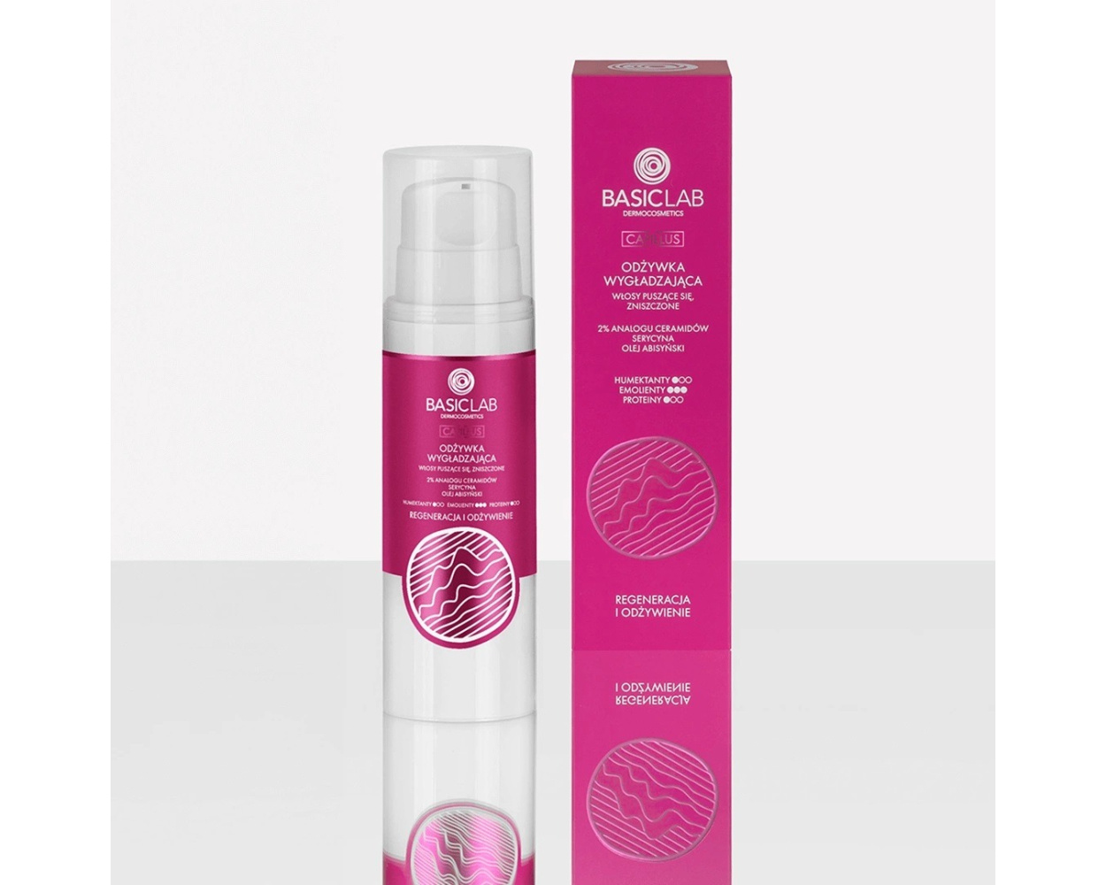 BasicLab Capillus Smoothing Conditioner to lekka odżywka wygładzająca, stworzona z myślą o pielęgnacji włosów puszących się, zniszczonych i osłabionych zabiegami chemicznymi lub stylizacją na gorąco. Jej formuła opiera się na połączeniu składników wzmacniających lipidy, takich jak 2% analogi ceramidów, oraz nawilżającej serycyny pochodzącej z jedwabiu. Kompozycję uzupełniają odżywcze oleje roślinne, które wspólnie działają na rzecz poprawy kondycji i wyglądu włosów, ułatwiając ich rozczesywanie i stylizację.