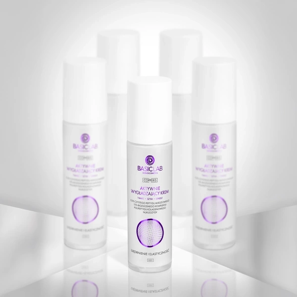 BasicLab Copperis Aktywny Wygładzający Krem to zaawansowany dermokosmetyk przeznaczony do kompleksowej pielęgnacji skóry twarzy, szyi i dekoltu. Jego specjalistyczna formuła opiera się na wysokim stężeniu składników aktywnych, w tym 0,3% peptydu miedziowego oraz 10% biokompatybilnego kompleksu polipeptydów kolagenowych. Produkt jest ukierunkowany na widoczne oznaki starzenia, takie jak utrata jędrności i elastyczności, w celu przywrócenia skórze młodszego wyglądu i wzmocnienia jej struktury.