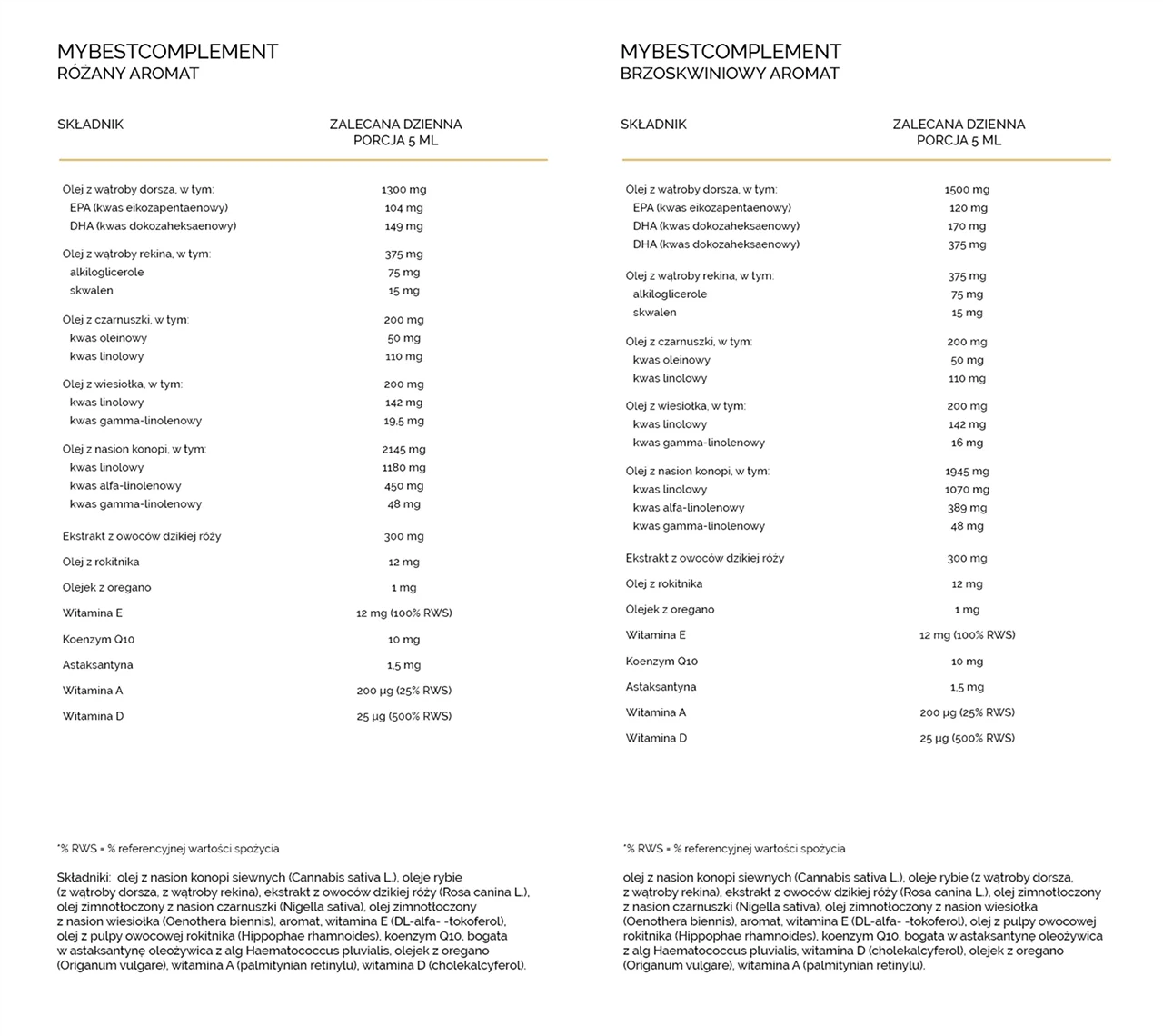 Olej z wątroby dorsza, w tym EPA (kwas eikozapentaenowy, DHA (kwas dokozaheksaenowy), Olej z wątroby rekina, w tym alkiloglicerole, skwalen, Olej z czarnuszki, w tym kwas oleinowy, kwas linolowy, Olej z wiesiołka, w tym, kwas linolowy, kwas gamma-linolenowy, Olej z nasion konopi, w tym kwas linolowy, kwas alfa-linolenowy, kwas gamma-linolenowy, Olej z róży, Olej z rokitnika, Olej z oregano, Witamina E, Koenzym Q10, Astaksantyna 5%, Witamina A, Witamina D.