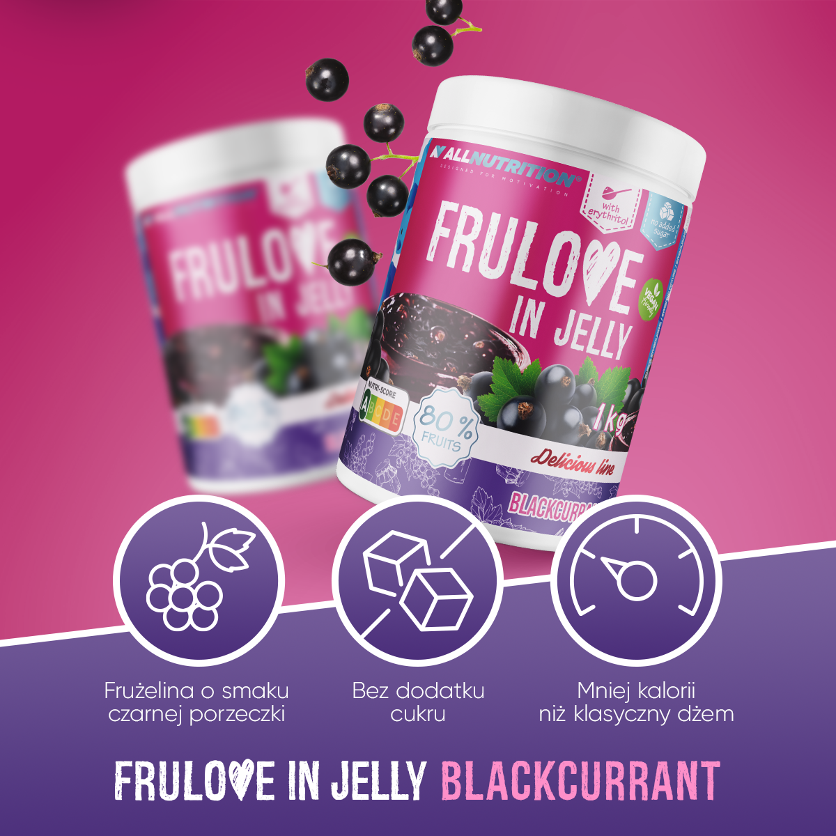 - Allnutrition Frulove in Jelly Blackcurrant to pyszna frużelina bez dodatku cukru, zawierająca aż 80% całych owoców czarnej porzeczki.
