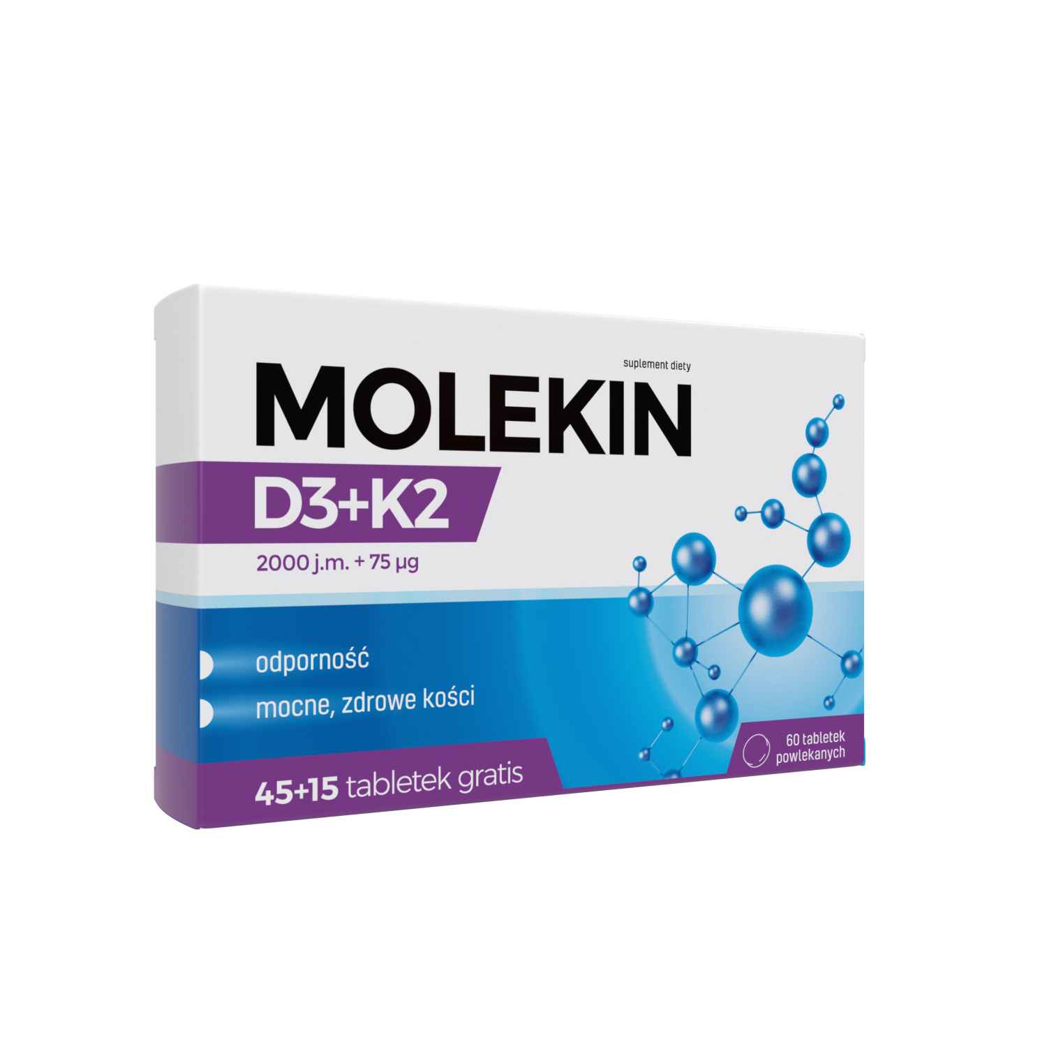 - Molekin D3 + K2 to suplement diety w postaci tabletek polkanych o wysokiej zawartości witaminy D i witaminy K.